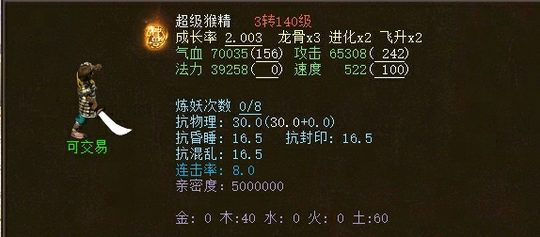 超级猴精介绍超级猴精属于绝版神兽,可在神兽大将处使用野生猴精和超级猴精精魄碎片、神兽材料一起点化而成。 点化野生猴精前置条件: 高成长 一次进化 飞升次数≥1 点化方式: 鸡驴点化:每次点化都有概率点化成功,有保底次数,若一定次数不成功则触发保底必定点化成功; 普通点化:按鸡驴点化进度等比例折算材料消耗,补齐材料直接点化成功。 飞升及数值变化: 超级猴精继承参与点化的野生猴精的各项培养数值与造型、颜色,并提升0.173成长率; 3转后超级猴精成长率最高可达到2.003。