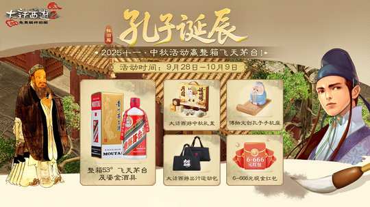 更多福利,尽在怀旧服中秋活动“孔子诞辰”《大话西游2免费版》怀旧服中秋十一活动 9月28日0点 全服开启,经典玩法“孔子诞辰”重启,还有一年一度的“月饼点”等你来拿,更有 整箱飞天茅台搭配鎏金酒具、大话西游出行背包、大话西游中秋礼盒及现金红包 等豪华实物大奖掉落,让少侠的十一假期满载而归!