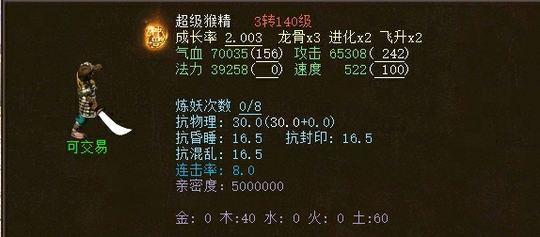 召唤兽进行水、火、风、雷系法术攻击时,有几率再攻击一次(要求灵性+法初值≥450)