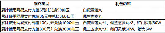 2)活动期间,角色≥20级在PC端游戏内或官方充值平台(网易充值中心、大神、将军令)充值通用点或专用点数,使用网易支付完成以下充值并兑换对应数量的仙玉,可获得对应的礼包