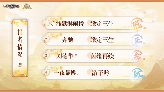 恭喜缘定三生服务器“ ◇浅 默 淋雨桥 ”荣获本届大赛冠军、缘定三生服务器“ 奔驰 ”率领的战队斩获 亚军 、 茵缘再续 服务器“ 刘德华ˇ ”带领的战队获得 季军 、 游子吟 服务器“ 一夜暴傅。 ”带领的队伍获得殿军荣誉!