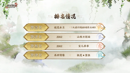 恭喜 镜花水月 服务器“ 1太虚幻境@ ‖瑶阶玉树‖ ”荣获本届大赛冠军、 2002 服务器“ 山西刀削面 ”率领的战队 赢得亚军 、 2002 服务器“ 宝儿乖乖 ”带领的战队获得 季军 、 再世情缘 服务器“ 极度 ★ 嚣张 ”带领的队伍获得殿军荣誉!