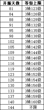 减负服3转后的等级上限开放调整,调整后的开服天数与开放等级上限对应如下: