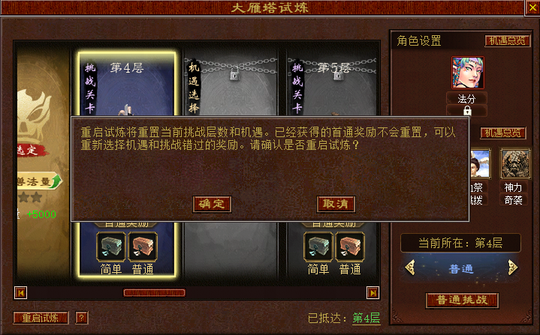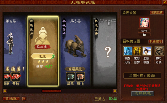 大雁塔试炼玩法 每周一0点 刷新 若对当前成绩不满意 可在玩法刷新前选择“重启试炼” 说不定搭配新的机遇增益 可获得更好的成绩!