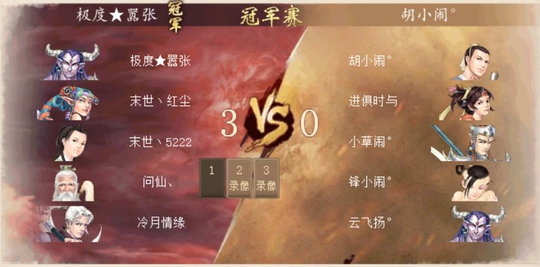 强强争锋终极舞台 两战连胜勇夺冠军冠军战中, “ 极度★嚣张 ” 带领的队伍 自 天干组中晋级, “ 胡小闹° ” 率领的战队则是从地支组 中突围 , 而 “ 极度★嚣张 ” 一方在五局三胜的赛制下连胜两场,同时由于自带1个胜场积分,所以他们最终以3:0的总比分荣获冠军!