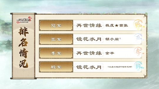 恭喜 再世情缘 服务器“ 极度★嚣张 ” 率领的 战队 赢得冠军、 镜花水月 服务器“ 胡小闹° ” 带领的队伍获得亚军、 再世情缘 服务器“ 金爷 ” 率领的战队获得季军、 镜花水月 服务器“ 1太虚幻境@II瑶 阶玉树 II ” 率领的队伍获得殿军 , 恭喜以上战队及选手!