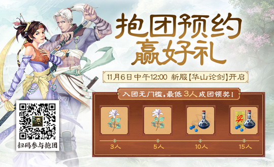 一、免费版怀旧服专属新服福利 速来领取1.兄弟抱团预约 领神兵抽奖券 兄弟抱团预约活动火热上线中,入团无门槛,最低3人成团领奖!活动开启至11月6日上午10:00,邀请好友一同抱团预约 『华山论剑』 新服,达到成团人数的成员都可获得限定抱团奖励,共计四大档位抱团人数好礼(3/5/10/15人),奖励还可叠加!