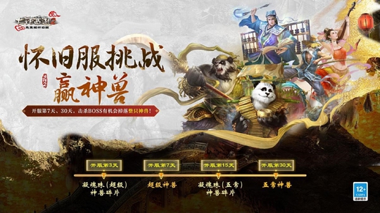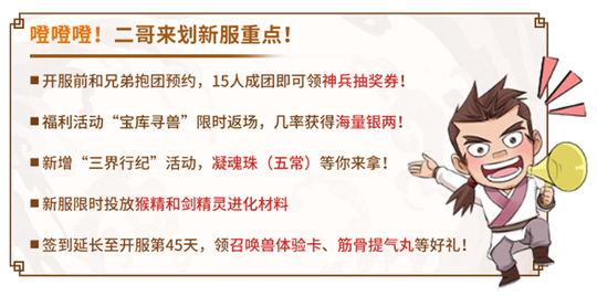 8.新服比武大会赛制优化 『华山论剑』 新服开服首周额外增开一轮比武,同时新服比武的淘汰赛将统一调整为三局两胜,决赛日将从八强赛开始决出冠军,新服比武的参赛队伍和整体奖励将进一步提升,有几率获得 一级神兵礼盒、神兽碎片、天书残卷 等奖励,且后续将会有PK玩法分组优化,为野生召唤兽、高级守护提供更多的表现舞台,敬请期待! 9.挑战 赢神兽 参与新服挑战玩法“旧敌当前”,击杀boss有机会获得 随机神兵礼盒、高级守护宝盒 ,在开服第3天击杀boss有机会获得 凝魂珠(超级) 、 神兽碎片 、 ,第7天击杀boss有机会获得 随机超级神兽 ,在开服第15天击杀boss有机会获得 凝魂珠(五常) 、 神兽碎片 ,第30天击杀boss有机会获得 随机五常神兽 !