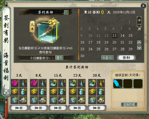 为回馈各位玩家的热爱,本周维护后将开启福利签到活动,当日天道酬勤积分或前一日天道酬勤积分达到要求即可进行签到,完成单日签到可获得经验、师贡等奖励;累计签到可获得抽奖资格,有几率抽取