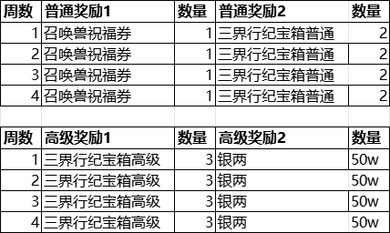 ②每周获取的经验达到指定数量可额外领取一份奖励,其中,三界行纪宝箱有机会开出 神兵礼盒、一阶仙器宝盒、凝魂珠(五常)、凝魂珠中、凝魂珠大 等奖励,周任务奖励如下: