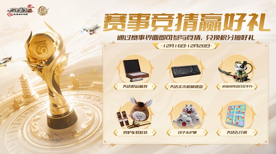 截止今天下午17:50分,非巅峰组最后一场比赛开始前,少侠仍可在游戏内赛事界面参与竞猜玩法,赢取竞猜积分奖励,使用积分可抽取 大话好运麻将、大话实木机械键盘、浪淘沙可动合金手办、鸡驴车载套装、包子头护腰、大话飞行棋 等周边好礼!
