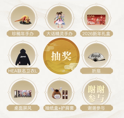 惊喜福利二:抽取珍稀年手办福利日到来前,扫码前往“大话2小助手”小程序,提前完成相应任务获取积分, 1月15日晚20:00 ,就能使用积分抽取 珍稀年手办 、 大话精灵手办 、2026新年礼盒 等精美周边!
