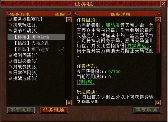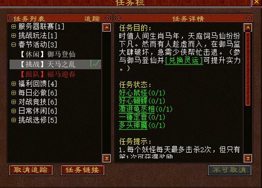 【休闲】御马登仙注:该玩法体验内容处于局部测试阶段,待全服正式上线后,将对其进行部分调整与优化。 “御马登仙”玩法十分休闲,角色等级达到40级即可参与,可单人或组队前往皇宫(73,15)与NPC弼马温对话进入副本。若选择组队,只有队长的积分能够参与排行榜排名。 春节活动期间,建议优先完成该任务,因为获得的灵运积分可用于兑换灵运,进而提升击杀其他春节活动怪物时的实力。