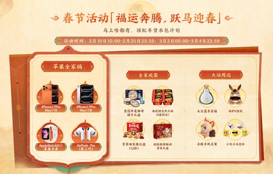 春节活动共欢聚 年货好礼送不停春节活动“福运奔腾 跃马迎春”将于 2月10日 至 2月25日 、 3月2日 至 3月4日 期间全服开启, 【组队】福马迎春、【挑战】天马之乱、【休闲】御马登仙、【团队】新年有约、【福利】福运奔腾 五大玩法齐登场(活动开启期间周末活动顺延)! 我们为这次马年春节活动准备了非常丰厚的福利,各位少侠参与春节活动即有机会获得: 苹果全家桶(iPhone 17 Pro Max 1TB、iPad Pro 11英寸、Apple Watch S11、 AirPods Pro ( 第三代 ) ) 、 全家欢聚礼盒 (皇冠丹麦曲奇饼干礼盒、海底捞自热火锅(4盒组合)、百草味坚果礼盒(12件)、旺旺糕饼联动零食礼盒) 、大话周边 等顶配年货好礼!