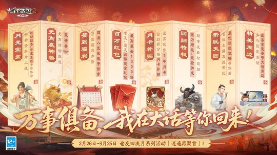 2月26日 起,我们将通过持续一个月的多重活动与丰厚福利,让老友回流月成为各位少侠 年后最佳回流时机 ,助力回归老友轻松归队,驰骋三界!万事俱备,只待老友逍遥而归!