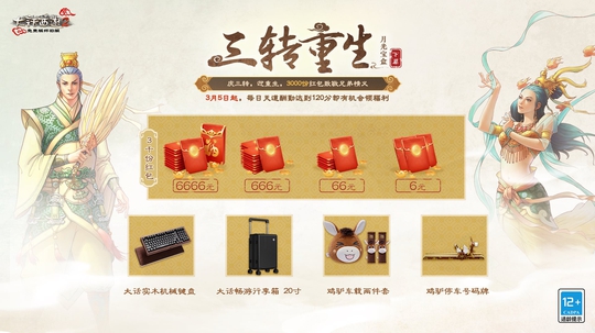 3月5日维护后至3月19日 ,少侠在领取120分天道酬勤积分奖励时,还有机会获得3000份红包(最高6666元)、实木机械键盘、鸡驴周边等资料片专属福利!