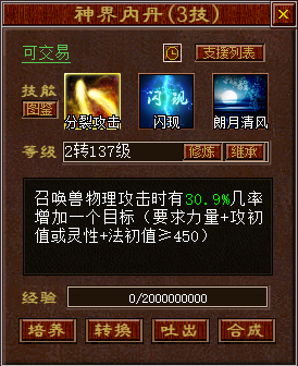 神界内丹可通过炼丹培养,获得最多同时附带3个不同技能的神界内丹(同时附带多个技能时,内丹等级共享)。