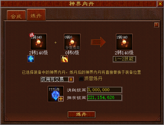 2)顶替炼丹:顶替炼丹时,分为主副内丹,主内丹必须为2/3技能、副内丹必须为1技能。继承规则如下: