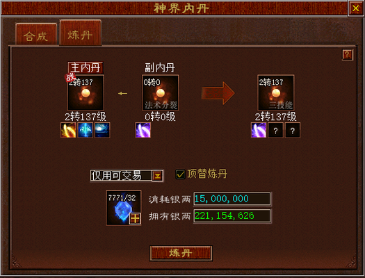 1)公式:2个神界内丹+内丹精华+银两=新的神界内丹。新内丹继承规则: