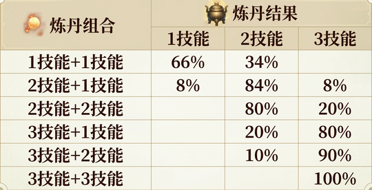 技能:从两个神界内丹的技能中随机保留数个,炼丹结果及概率分布可参考下表